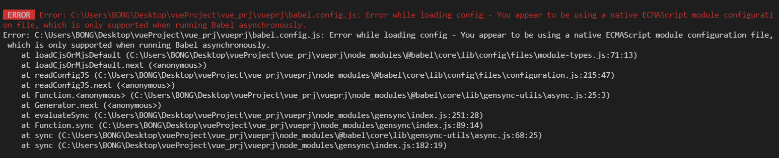 Error: C:\Users\BONG\Desktop\vueProject\vue_prj\vueprj\babel.config.js: