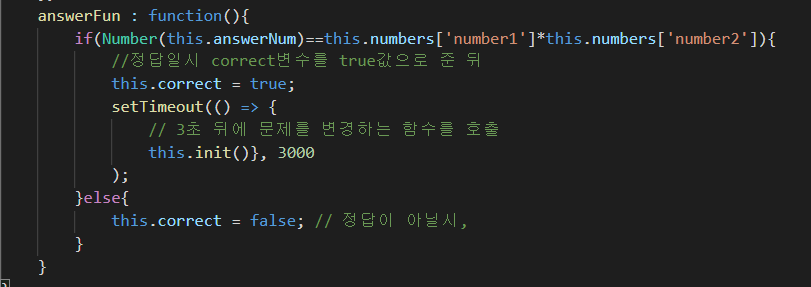그래서 정답일 경우에는 약 1~3초 후에 문제가 바뀌도록 바꾸려고 했는데, 그때 쓴 게 setTimeOut함수이다.
