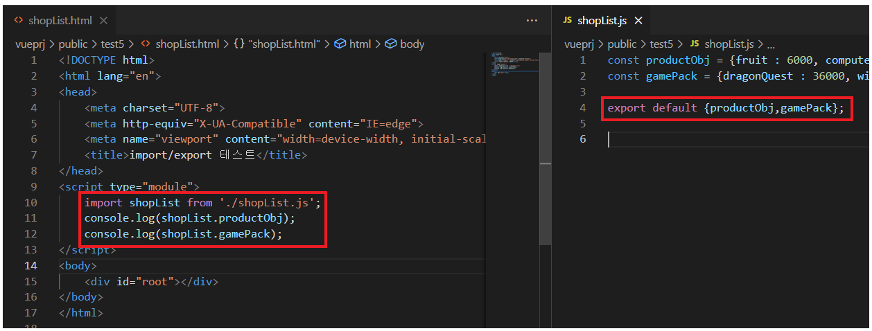 위처럼 shopList.js라는 파일 하나에 객체를 2개 선언해놓고 export default로 productObj, gamePack 2개를 export