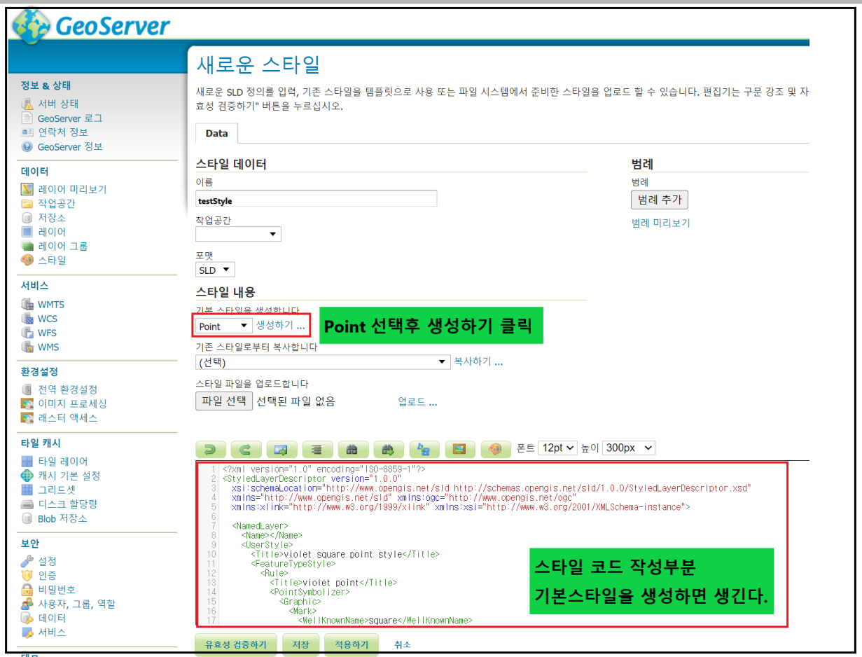기본스타일을 생성해주자. 우리는 point 스타일을 생성할 것이기 때문에 Point를 선택해주고 생성하기 클릭.