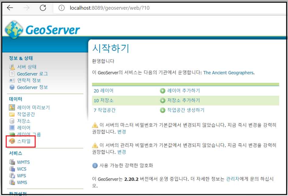 정리하고자 한다. 우선 GeoServer를 구동하고 접속한다. (본인은 2.20 버전 기준으로 설명)