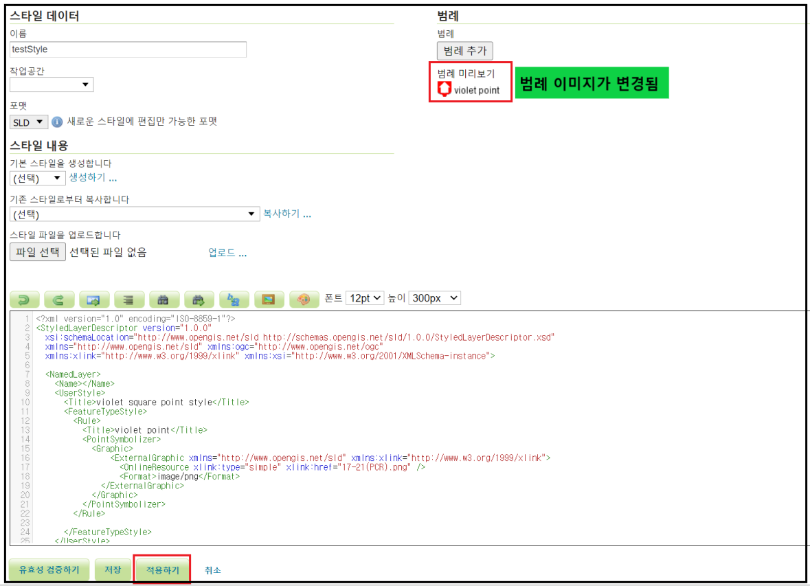 됬다. 이제 이 스타일을 저장한 뒤, 레이어에 testStlye을 적용하면 파란색 point대신 저 마커가 찍힐 것이다.