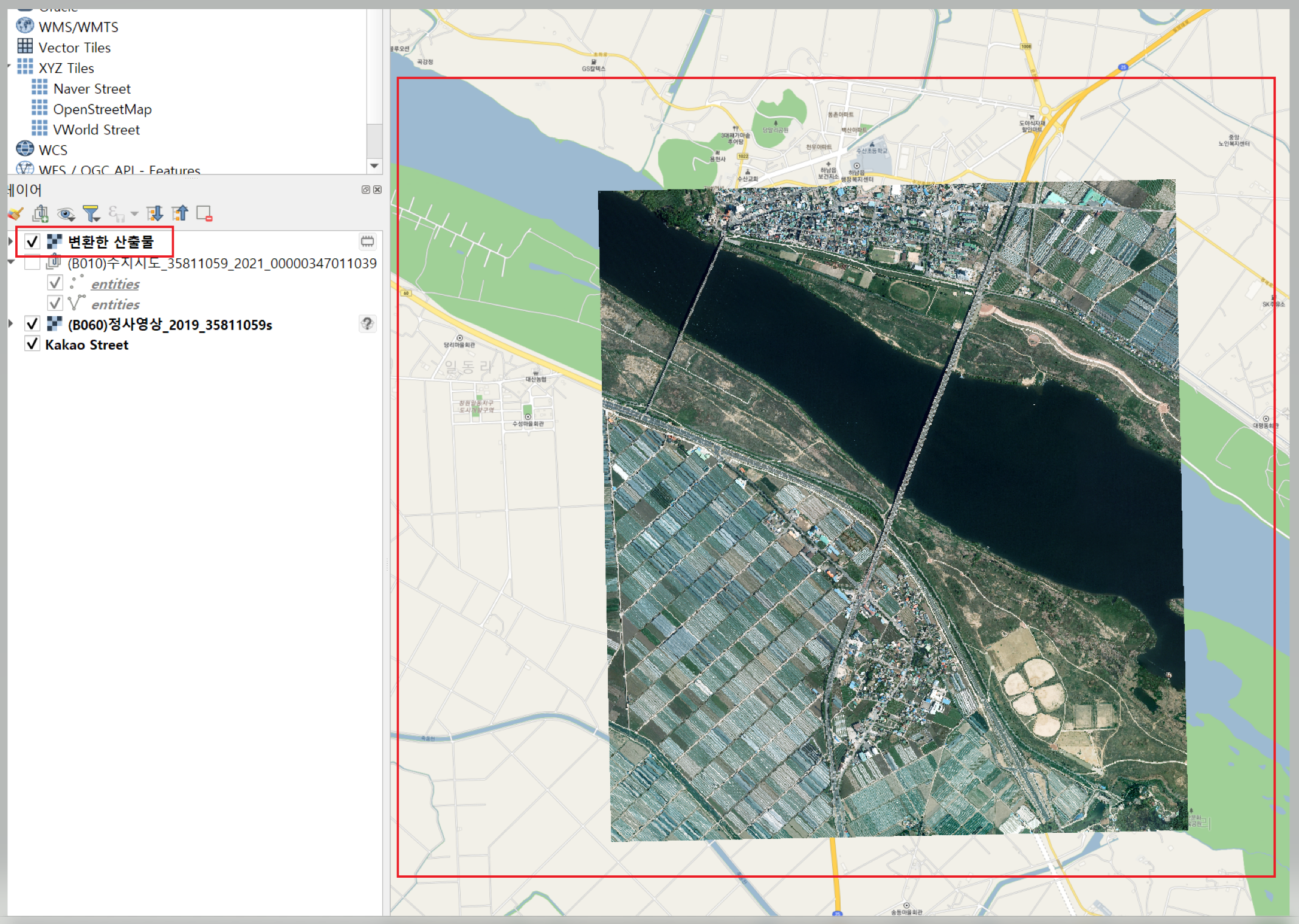 좌측 레이어 패널을 보면 "변환한 산출물"이 있는데, 이게 새로 생성 된 정사영상 레이어이다.