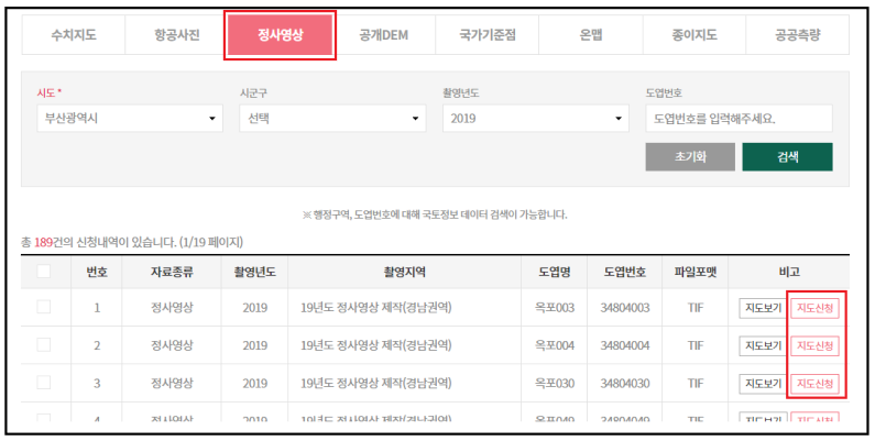 정사영상에서 원하는 정사영상을 검색한 뒤 [지도신청]을 통해 다운로드을 받도록 하자.