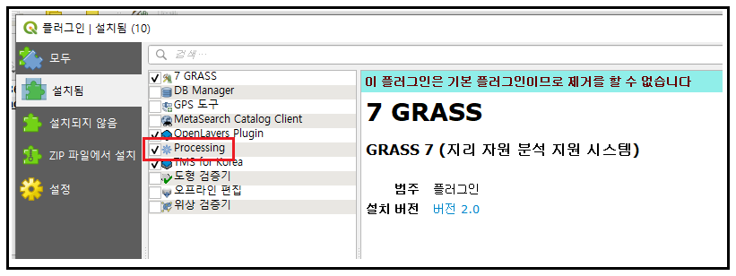2. 설치됨 - Processing 체크