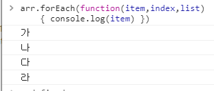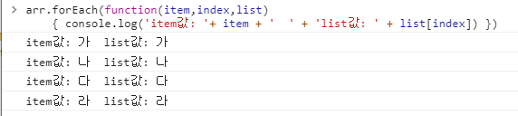 위에서 사용한 forEach함수는 'e' 라는 인수 하나만 가지고 있지만 아래는 item, index, list라는 인수 3개를 가지고 있다. 각각을 설명하자면