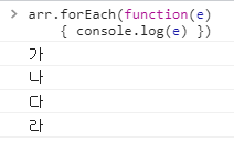 위와 같이 배열.forEach( function(e) { 작업내용 } );과 같이 표현한다. 보통 배열안에 있는 값을 추출하거나 값을