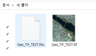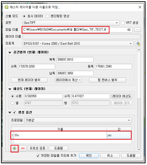 다른 건 건들 지 말고, 빨간 박스 쳐진 곳만 설정하고 확인을 누르면 .tif와 .tfw파일이 생성되는 것을 확인 할 수 있다.