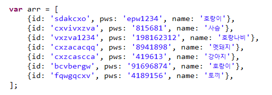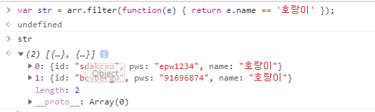 여기서 name이 '호랑이'인 객체들만 추출하여 새로운 배열을 만든다고 하면 다음과 같이 조건을 주어 filter함수를