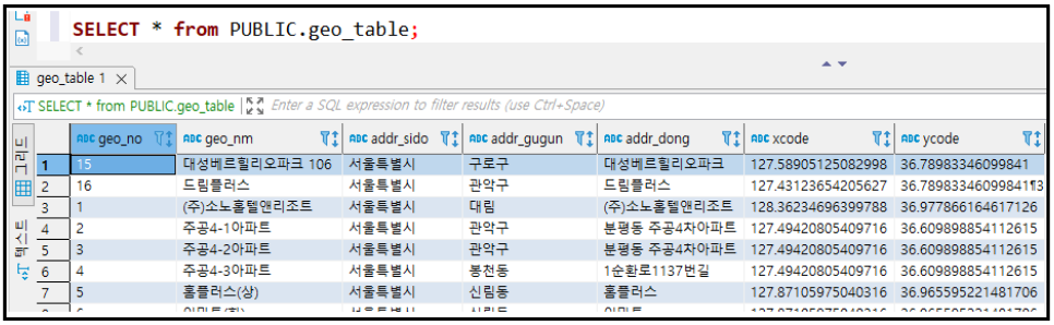 (geo_no, geo_nm, addr_sido, addr_gugun, addr_dong, xcode, ycode)