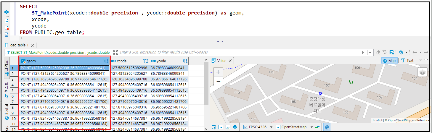 ST_MakePoint함수에 담아주었다. 어려울 거 전혀 없다. 그럼 결과는 아래와 같다.