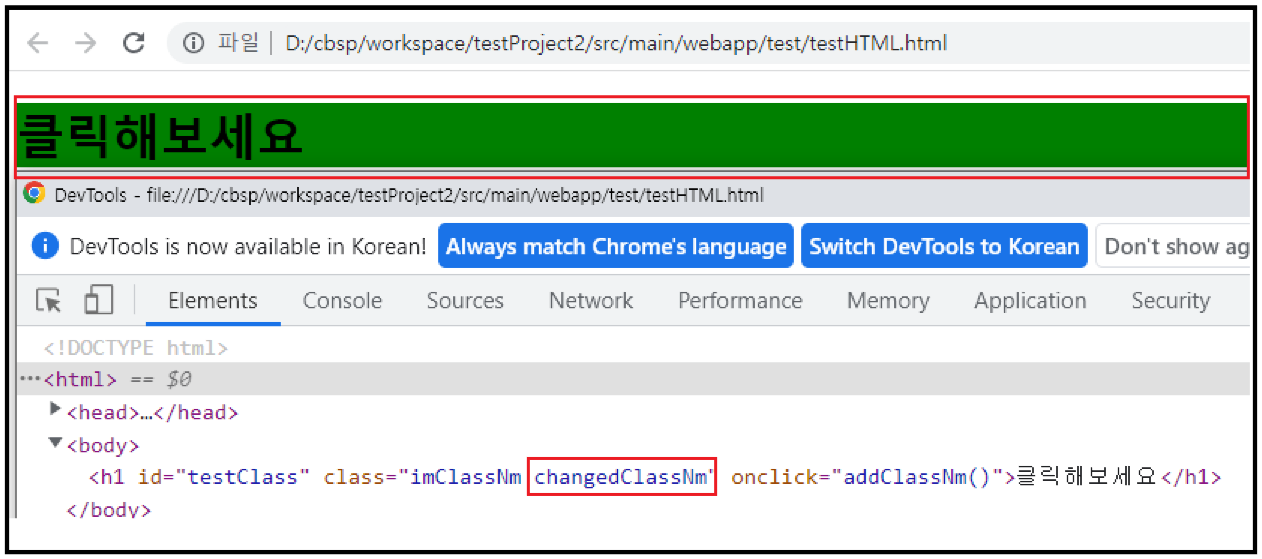 우리의 목표는 "클릭해보세요"를 클릭하면 해당 <h1>의 class에