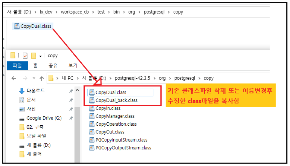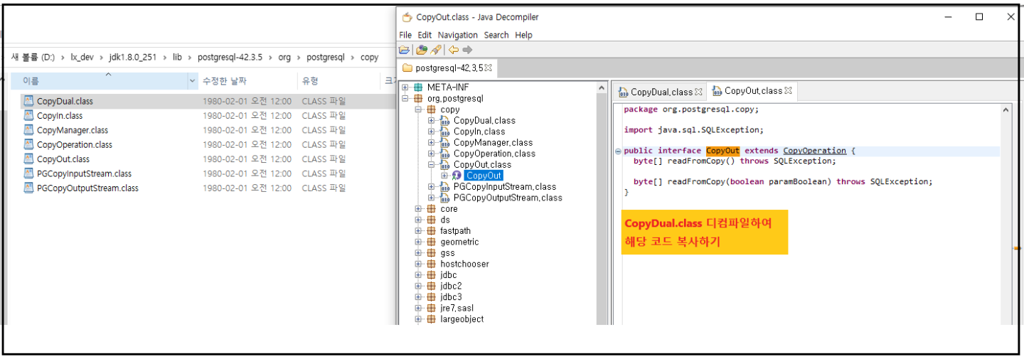 postgresql.jar의 org.postgresql.copy 패키지 안의 CopyDual.class를 수정하여