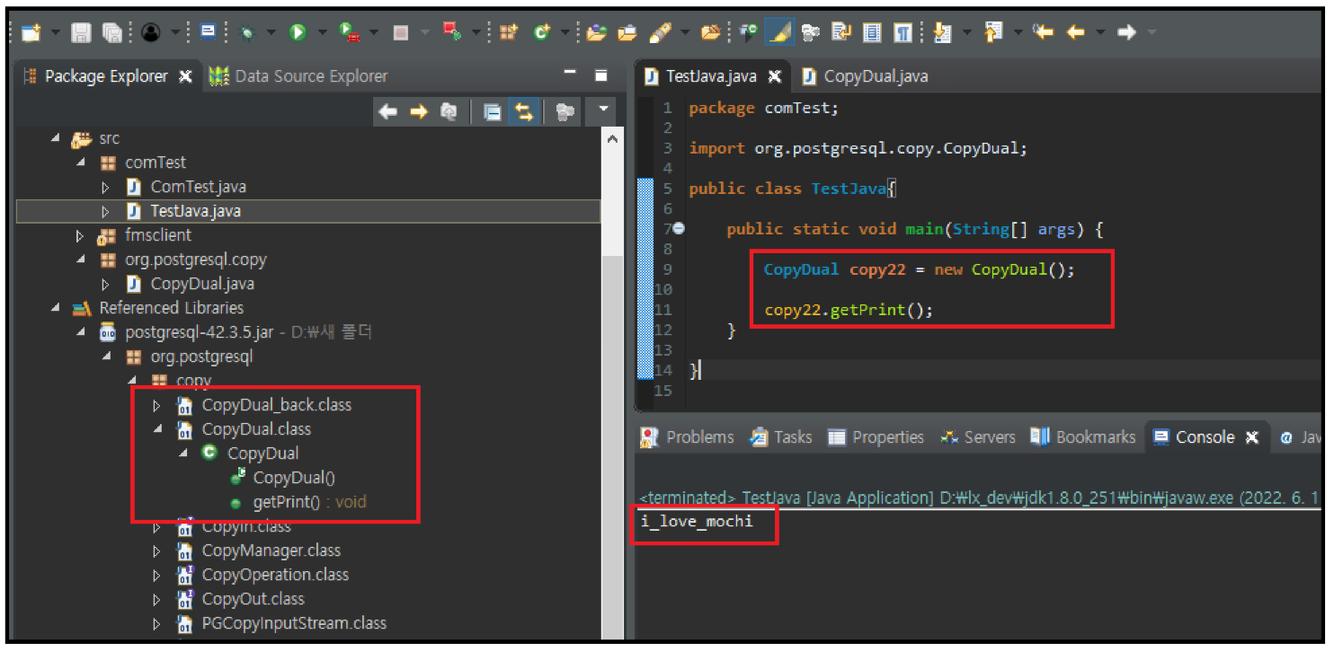TestJava.java를 만들어 CopyDual.class에 만든 getPrint함수를 호출하였다.