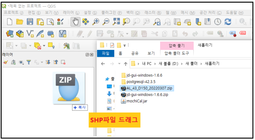쪼개어져 있는 SHP파일을 레이어 목록으로 드래그 해준다.