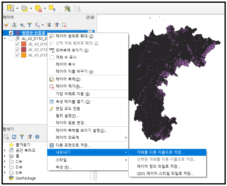 병합한 레이어를 SHP파일로 내보내기