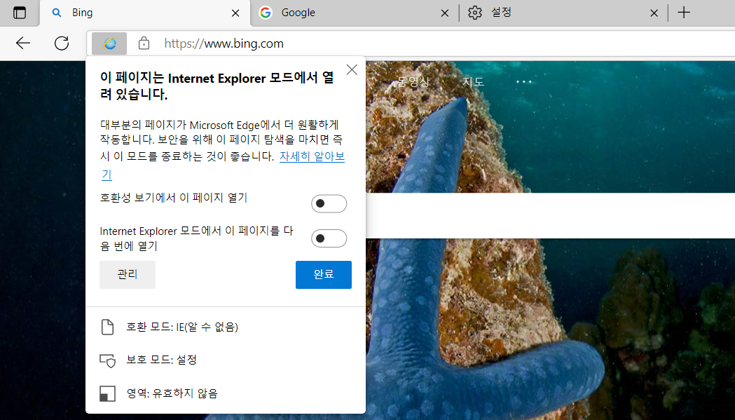 참고 : IE모드가 필요한 환경의 페이지에서만 활성화 되고, 그러지 않는 경우는 비활성화 된 상태로 보인다.