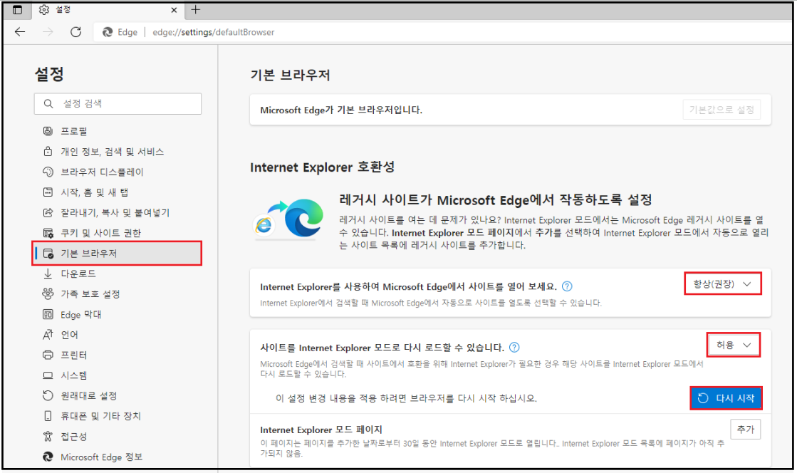위에서 "Internet Explorer 모드에서 탭 다시 로드" 버튼을 눌렀다면