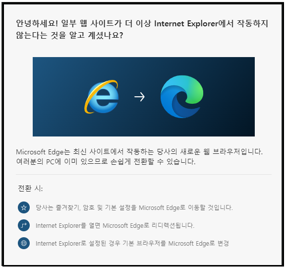 인터넷 익스플로러 실행하면 이제 자동으로 엣지로 전환되게 되었다. 근데 작업을 하던지, 어떤 웹사이트에서는