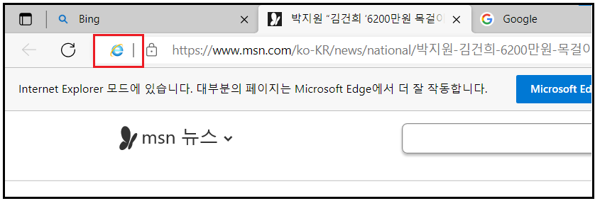 주소창 좌측에 저 버튼의 유무로 현재 IE모드가 활성화 된 상태라는 것을 확인할 수 있다.