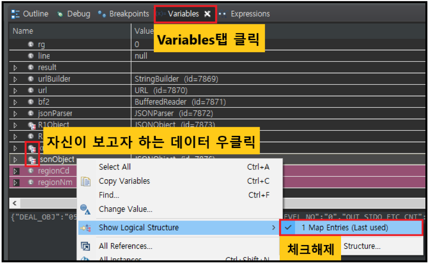 하나하나 보는데, 뭐만 하면 "com.sun.jdi.objectcollectedexception occurred while retrieving value"