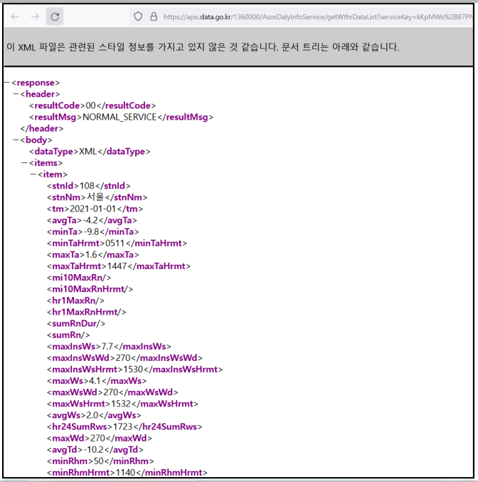 위의 URL에 본인의 인증키를 그대로 넣고 주소창에 치면 데이터를 확인할 수 있다. 나는 이걸 사용 할 예정이다.
