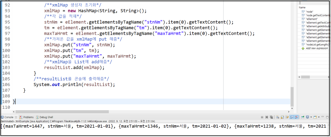 * 받아온 xml문자열인 result을 가지고 Document인 xml을 선언