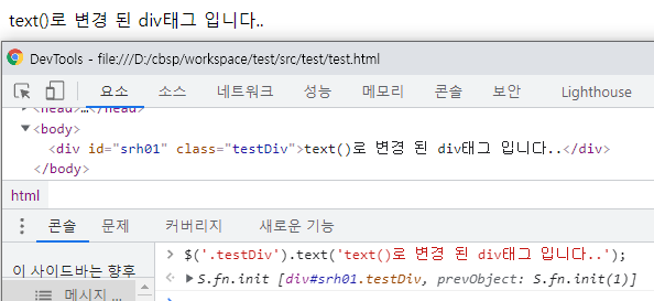 변경할 요소를 선택자로 선택한 뒤 .text()내에 변경하고 싶은 텍스트를 넣어주면 된다.