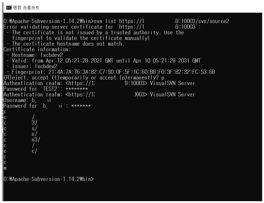 2) "svn list [SVN URL]" 을 입력해준다. 아래는 샘플
