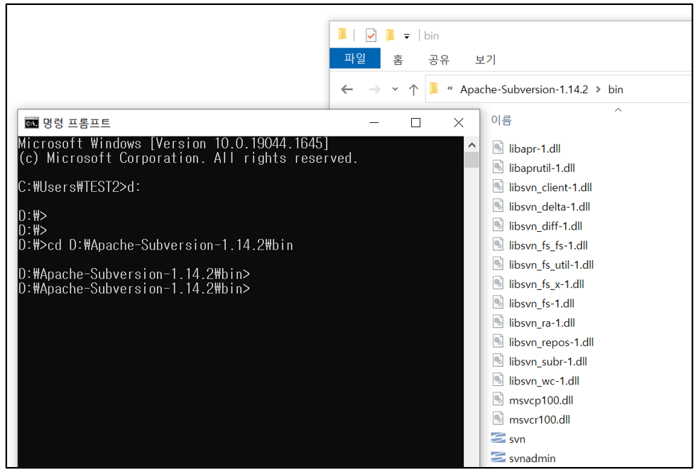 1) CMD창을 열고 SVN이 설치되어 있는 디렉터리의 bin 경로로 찾아가보자.