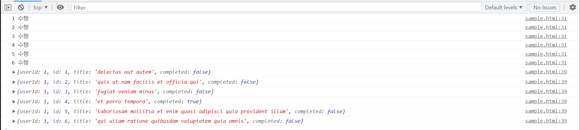 위의 기본문법과 샘플은 javascript.info에서 제공하는 코드이다. 테스트 해보면 3개의 프라미스 객체가 있고