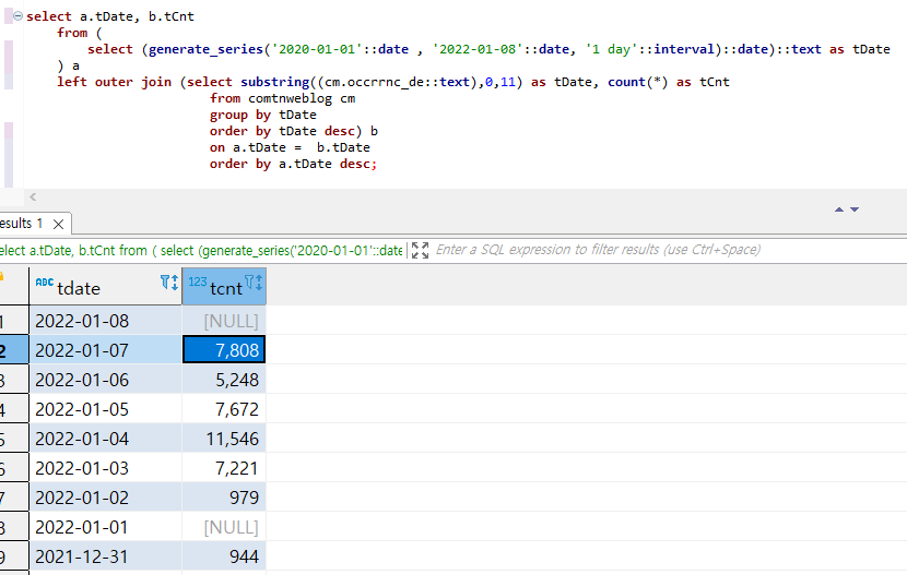 SELECT 해 온 결과를 보면 기존에 없던 2021-01-01도 date를 가져 오게 되었다. 해당 쿼리는 일별 이지만