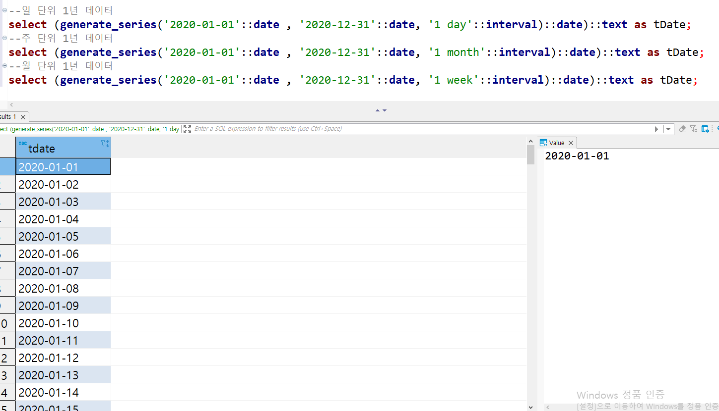 generate_series()의 파라메터 값을 1 month, 1 week 으로 변경하면 월별/주별 통계도 뽑아 낼 수 있다!