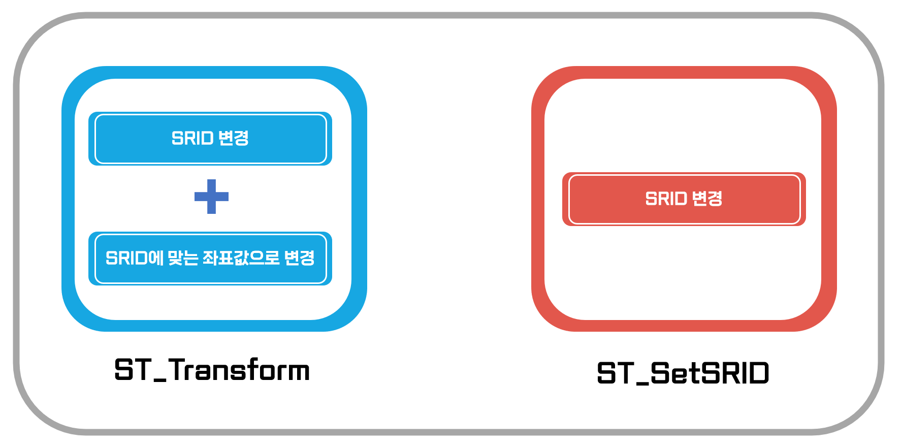 ST_Transform과 ST_SetSRID은 둘다 좌표계를 변경할 때 사용하는 PostGIS에서 제공해주는 내장함수이다.