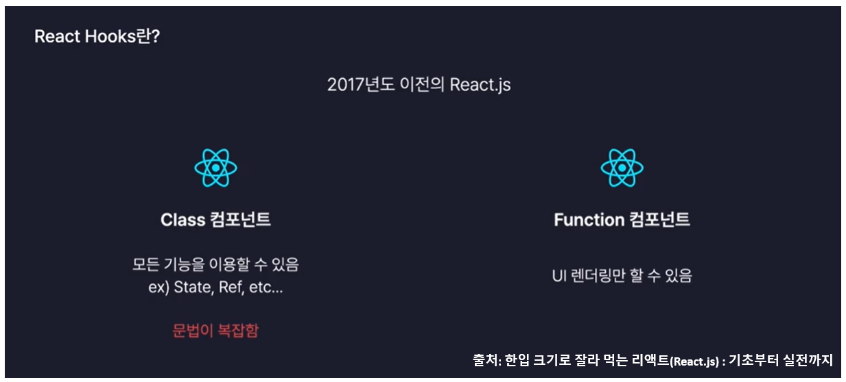 16.8버전 이후 함수형 컴포넌트에서도 state 및 life cycle API를 사용 할 수 있게 되면서