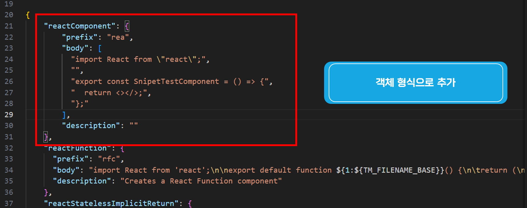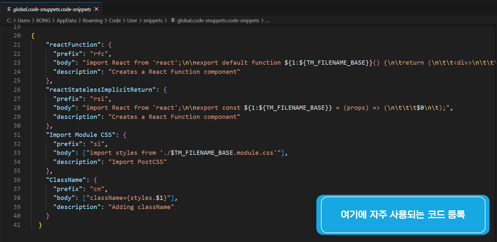 이제 복사할 소스를 그대로 global.code-snuppets.code-snippets 파일에 붙여 넣도록 하자.