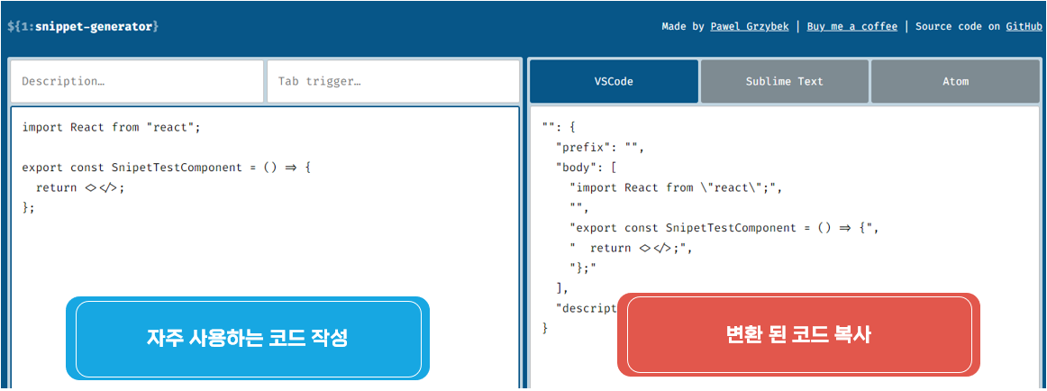 이제 저 위에 넣을 코드를 작성해야 하는데, 코드 스니펫 코드를 간단하게 작성해주는 사이트가 있다.