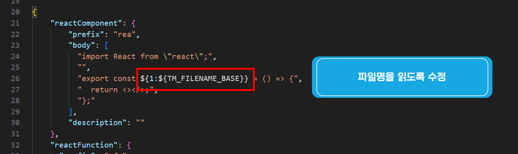 나는 아래와 같이 "prefix": "rea"라고 선언했다. 이제 컴포넌트 파일을 만들고 rea라고 입력하면