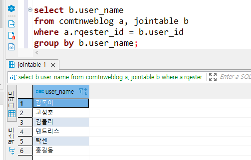 이 상황에서 양쪽 테이블에 존재하는 사용자의 이름을 출력하려면 다음과 같이 조인하면 될 것이다.