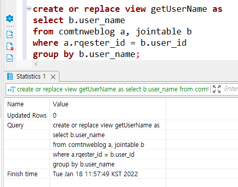 근데 해당 결과를 쿼리문이 아닌 테이블을 통해 용이하게 관리하고자 한다면 뷰테이블을 활용하면 된다.