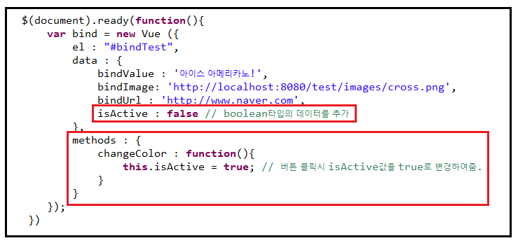 3. 버튼을 클릭하면 changeColor라는 함수를 호출하고 isActive라는 데이터를 true로 변경.