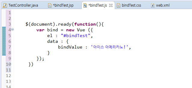 그럼 id값이 bindTest인 ( el 옵션은 Vue 인스턴스에 연결할 HTML DOM 요소를 지정합니다! ) 영역에 Vue 인스턴스를