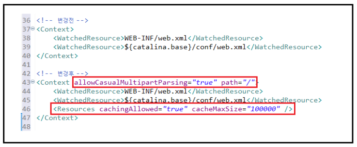 | <?xml version="1.0" encoding="UTF-8"?> <Context allowCasualMultipartParsing="true" path="/"> <Resources cachingAllowed="true" cacheMaxSize="100000" /> </Context> |