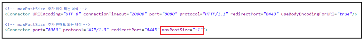 이렇게 maxPostSize="-1"로 수정했더랬라. 원래 아무것도 모르고 maxPostSize도 3000000000와 같이 수정을 하였는데,
