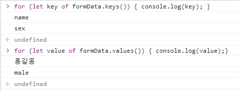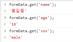 | formData.append('name','홍길동'); formData.append('age','18'); formData.append('sex','male'); ![]() |