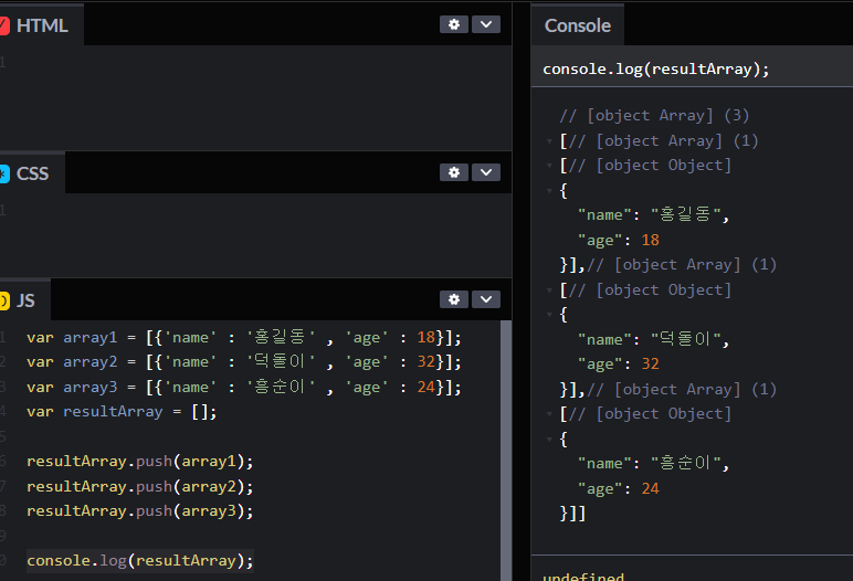 우선 내가 배열을 3개 만들었고, resultArray라는 배열을 만들어 그 안에 push해주고 있다.
