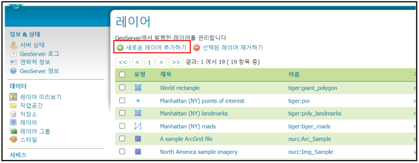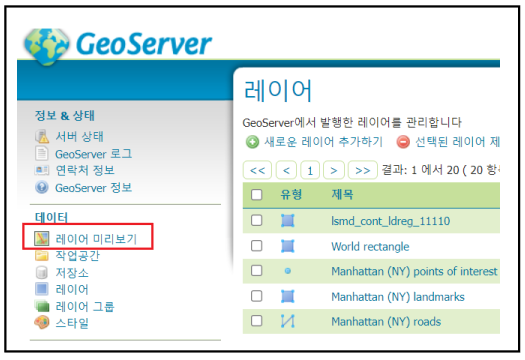 지오서버 로그인을 한 뒤, 레이어 메뉴로 들어가준다.