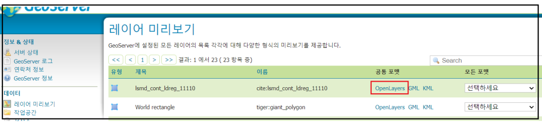 레이어 미리보기 메뉴로 들어온 후 생성한 레이어의 공통 포맷에서 OpenLayesr를 선택하면 레이어가 정상적으로