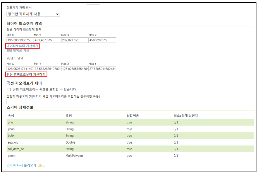 를 각각 눌러주어 위경도 데이터를 넣어주고 저장을 하면 된다. 나중에 수정 가능한 사항이므로, SRID가