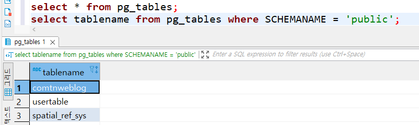 select * from pg_tables; -- 모든 테이블 조회
